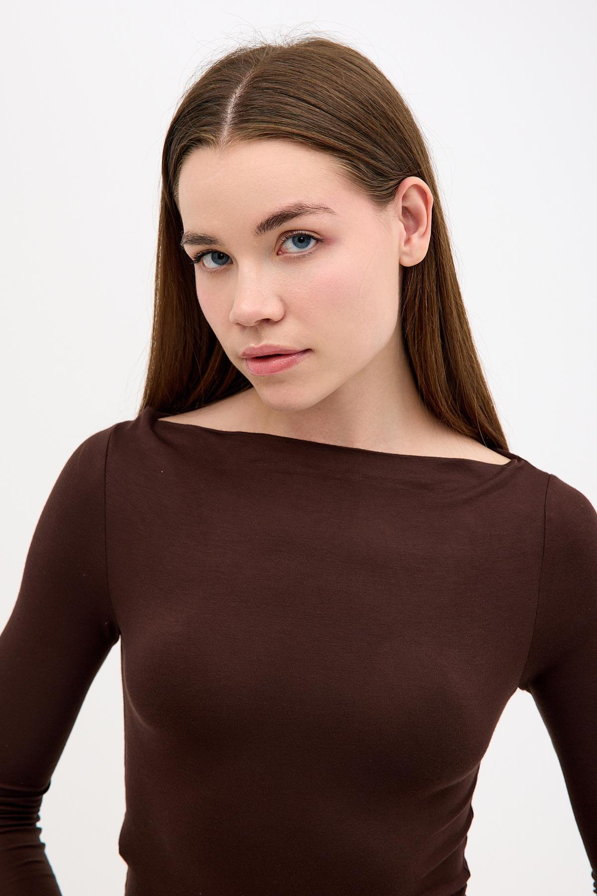Degaje Kayık Yaka Yanı Büzgülü Pamuklu Kahverengi Bluz (BLZ1000039)