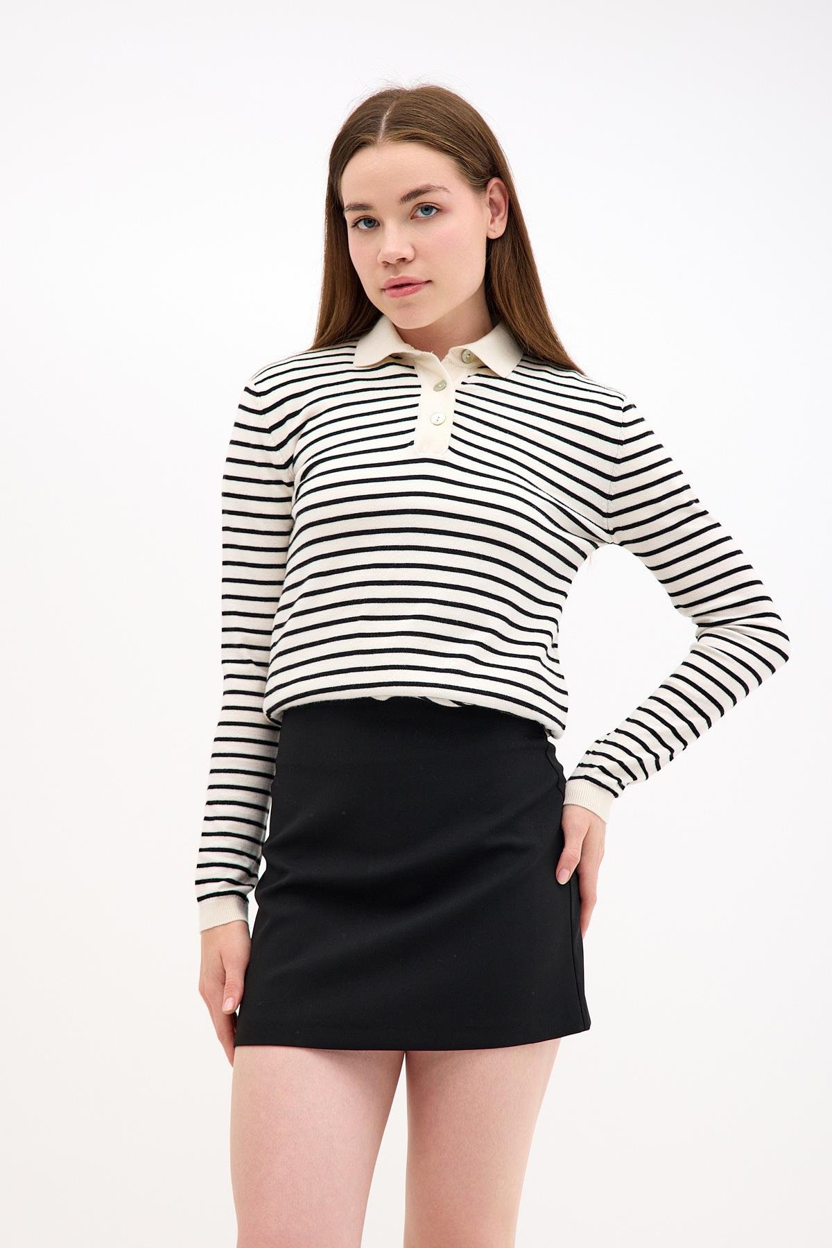 Polo Yaka Krem-Siyah İnce Çizgili Pamuk Triko (TRK100038)